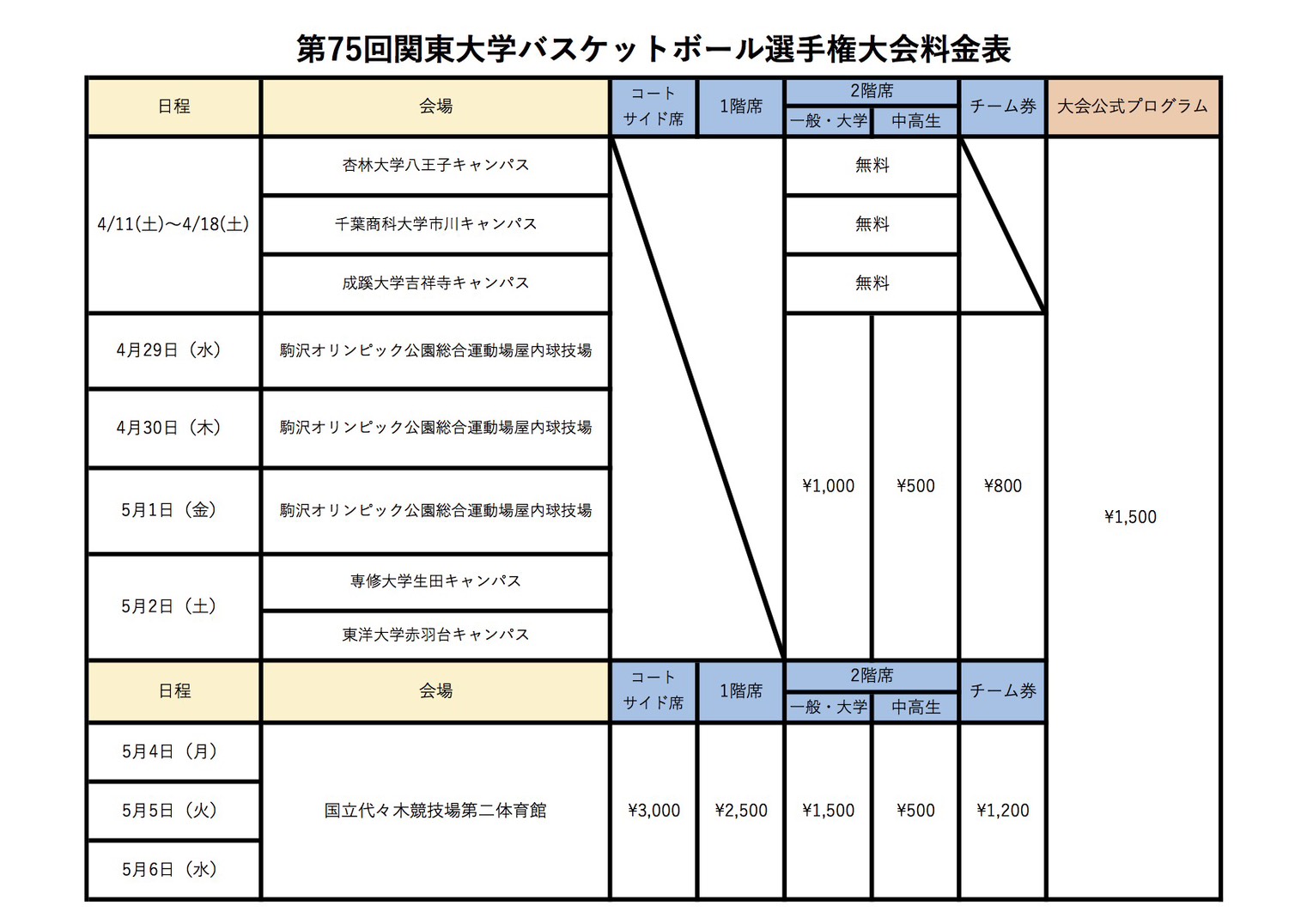 第75回関東大学バスケットボール選手権大会 入場料金について